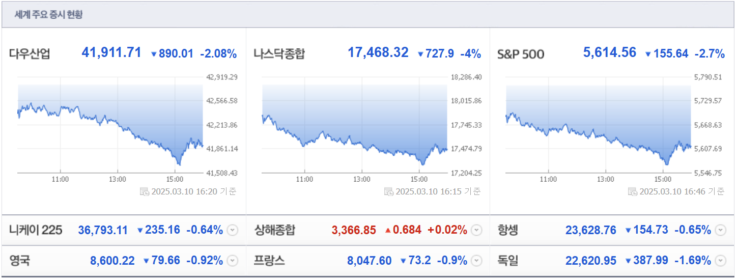 2024년 3월 10일, 뉴욕증권거래소(NYSE)에서 다우존스 30 산업평균지수는 전일 대비 890.01포인트(2.08%) 하락하여 41,911.71에 거래를 마감했습니다. 스탠더드앤드푸어스(S&P) 500지수는 155.64포인트(2.70%) 하락하여 5,614.56에, 나스닥 종합지수는 727.90포인트(4.00%) 폭락한 17,468.32에 장을 마쳤습니다. 특히 나스닥 지수는 작년 10월 이후 처음으로 1만 8천 선이 무너졌으며, 하루 낙폭이 4% 이상인 경우는 2022년 9월 이후 처음입니다.