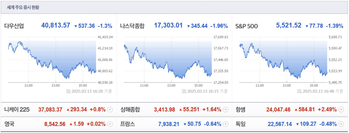 | CPI 둔화와 관세 전쟁의 여파로 뉴욕증시 혼조세 마감 (0) | 2025.03.13 |