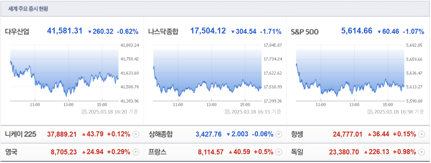 2025년 3월 18일 뉴욕증시의 3대 지수가 하락세로 마감했습니다. 이는 미 전기차 업체 테슬라를 비롯한 대형 기술주들의 주가가 떨어지며 이틀간의 상승세가 멈췄기 때문입니다. 관세 정책에 대한 불확실성이 여전한 가운데 투자자들은 다음 날 예정된 미 연방준비제도(Fed)의 기준금리 결정 및 점도표 공개를 기다리고 있습니다. 동시에, 미국과 러시아 정상의 우크라이나 전쟁 관련 부분 휴전 합의는 국제유가에 영향을 미쳤습니다.