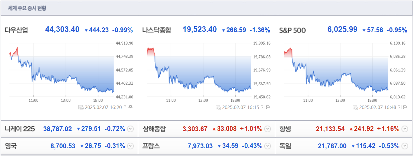 2025년 2월 7일(현지시간) 뉴욕증권거래소(NYSE)에서 다우존스30산업평균지수는 전 거래일보다 444.23포인트(0.99%) 하락한 4만4303.40으로 마감되었습니다. 스탠더드앤드푸어스(S&P)500 지수는 57.58포인트(0.95%) 하락해 6025.99를 기록했으며, 나스닥종합지수는 268.59포인트(1.36%) 급락한 1만9523.40으로 장을 마쳤습니다.