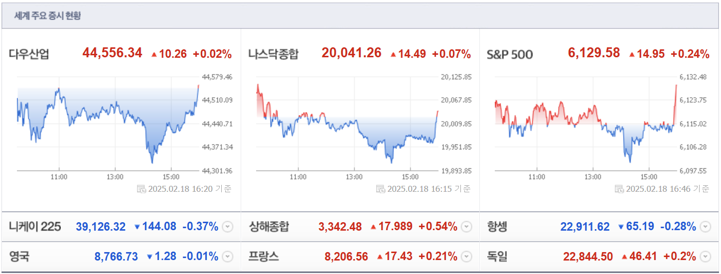 2025년 2월 18일(미국 동부시간), 뉴욕증권거래소(NYSE)에서 3대 주가지수가 강보합세로 마감하였습니다. 장 초반에는 약보합 상태였으나, 마지막에 매수세가 몰리며 상승세로 돌아섰습니다. 시장을 움직일 뚜렷한 재료는 부족했으나, 주가는 소폭 상승하였습니다.